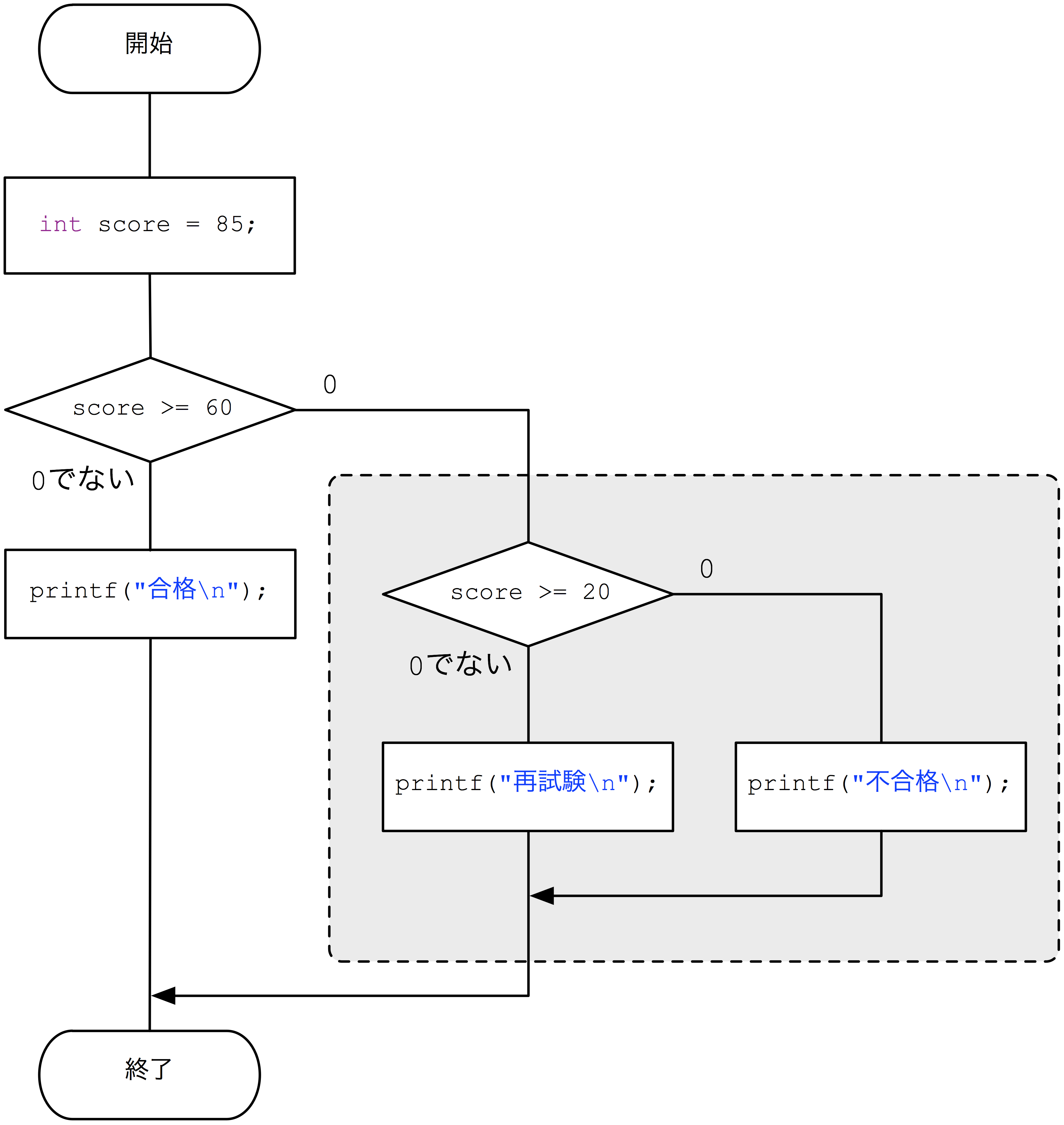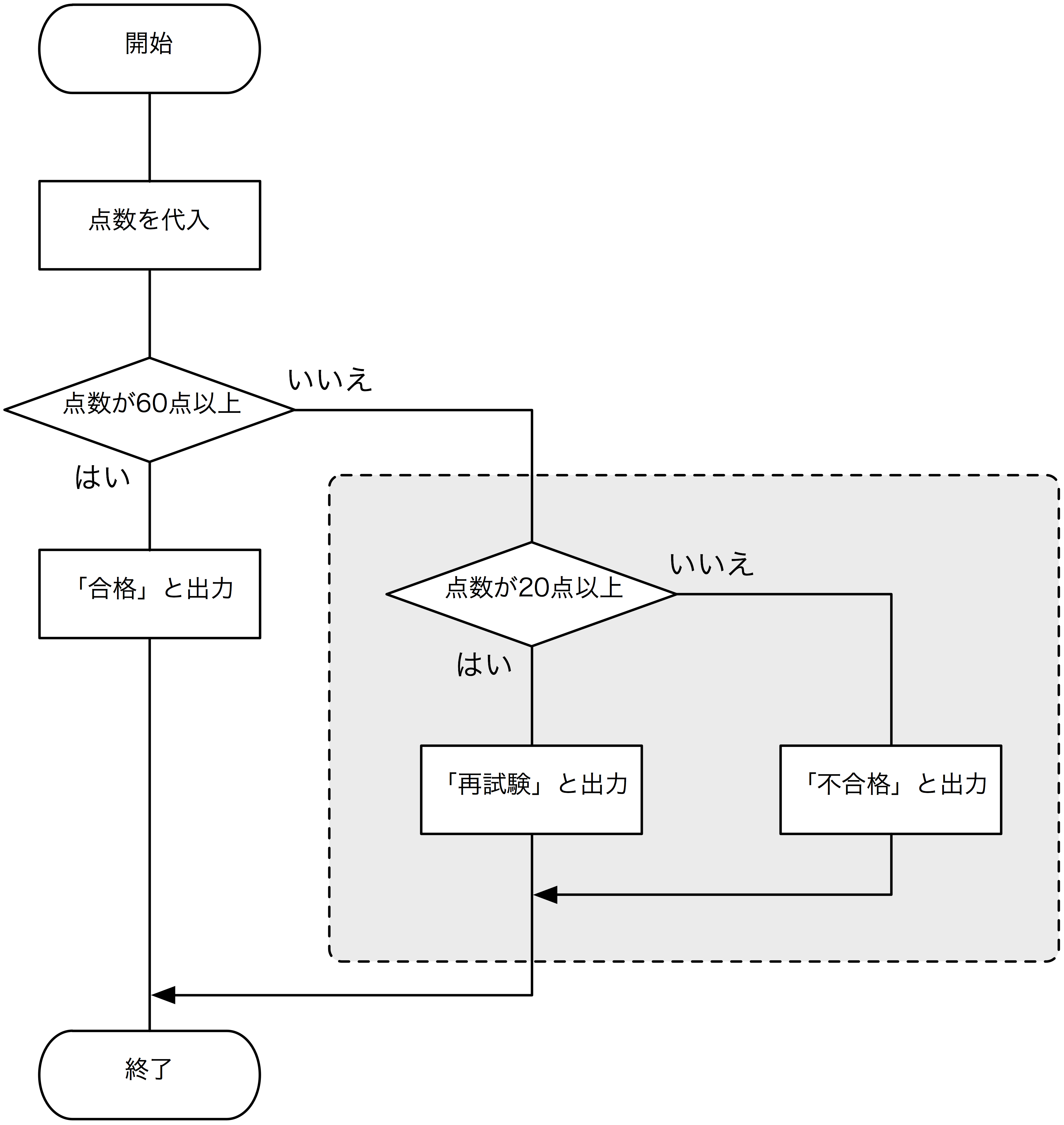 最初の条件「点数が60点以上」を満たさないときに行われる処理が点線で囲まれたグレーの部分で、一つの条件分岐になっています。