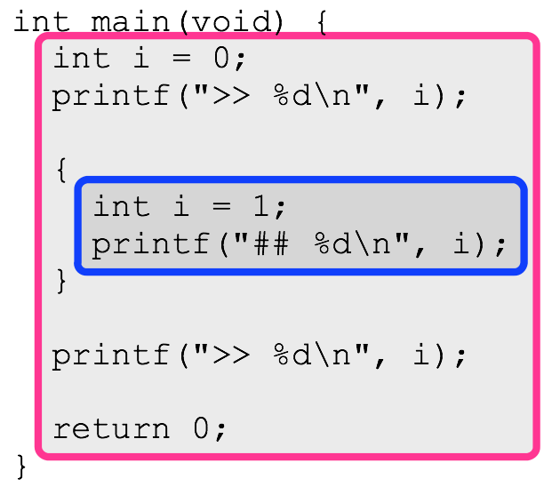 int main(void) { int i = 0; printf(">> %d\n", i); { int i = 1; printf("## %d\n", i); } printf(">> %d\n", i); return 0; }