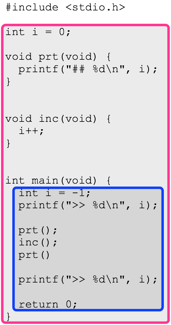 #include <stdio.h> int i = 0; void prt(void) { printf("## %d\n", i); } void inc(void) { i++; } int main(void) { int i = -1; printf(">> %d\n", i); prt(); inc(); prt(); printf(">> %d\n", i); return 0; }