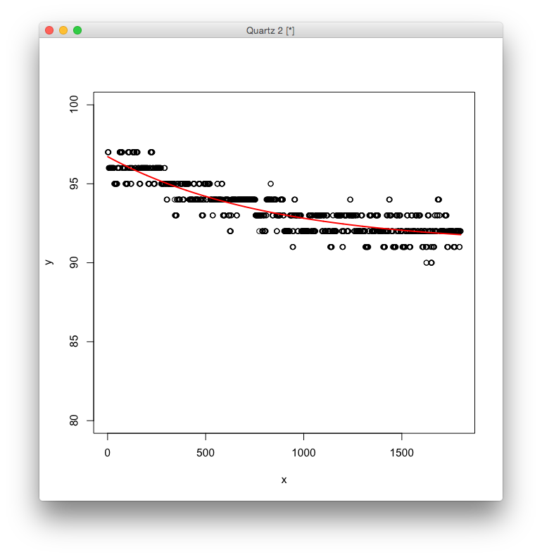 > data <- read.csv("data.csv") > head(data) x y 1 1 97 2 2 97 3 3 97 4 4 97 5 5 97 6 6 96 > plot(x, y, ylim=c(80,100))