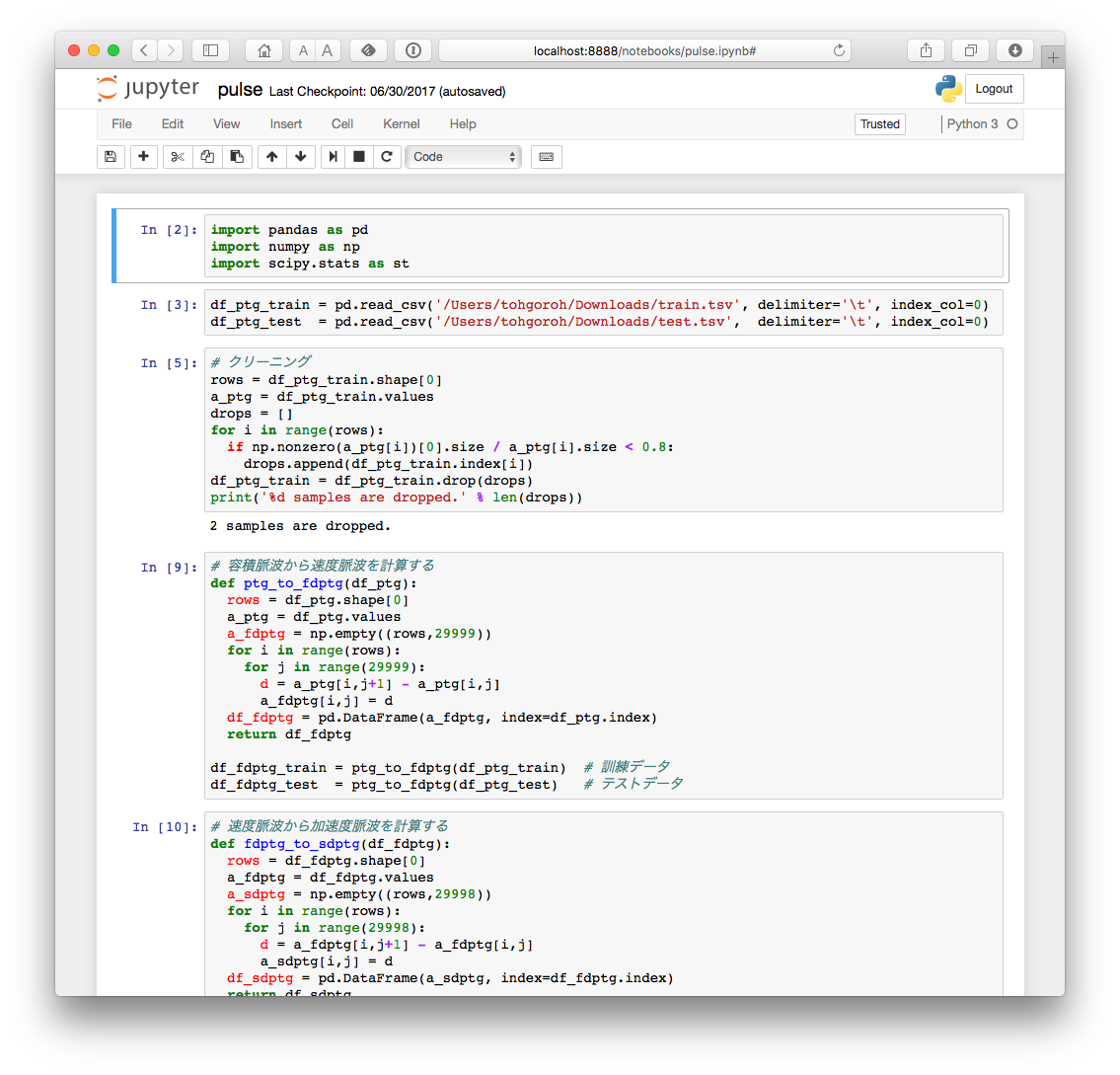 プログラムをセルごとに実行します。 セルを削除したり、連続したセルを一つに結合したり、セルの順序を入れ替えたり、途中にセルを追加することができます。