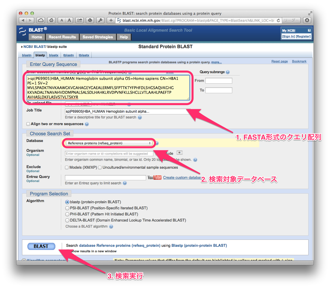 ここでは,タンパク質のアミノ酸配列をクエリーとしてアミノ酸配列を検索するblastpを対象にします.