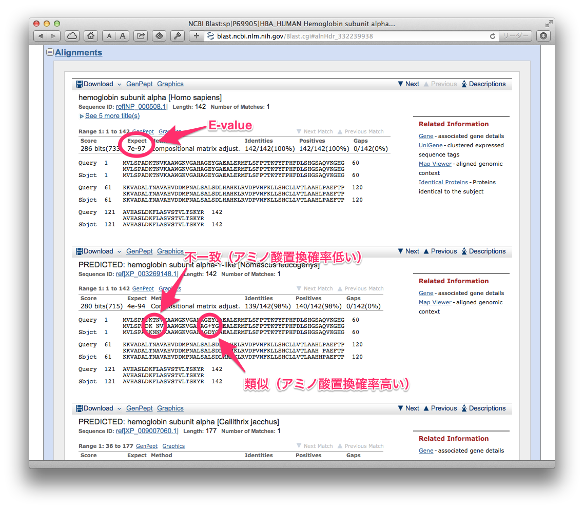 最後に,検索されたタンパク質のそれぞれについて,ペアワイズ・アラインメントの結果が表示されています.