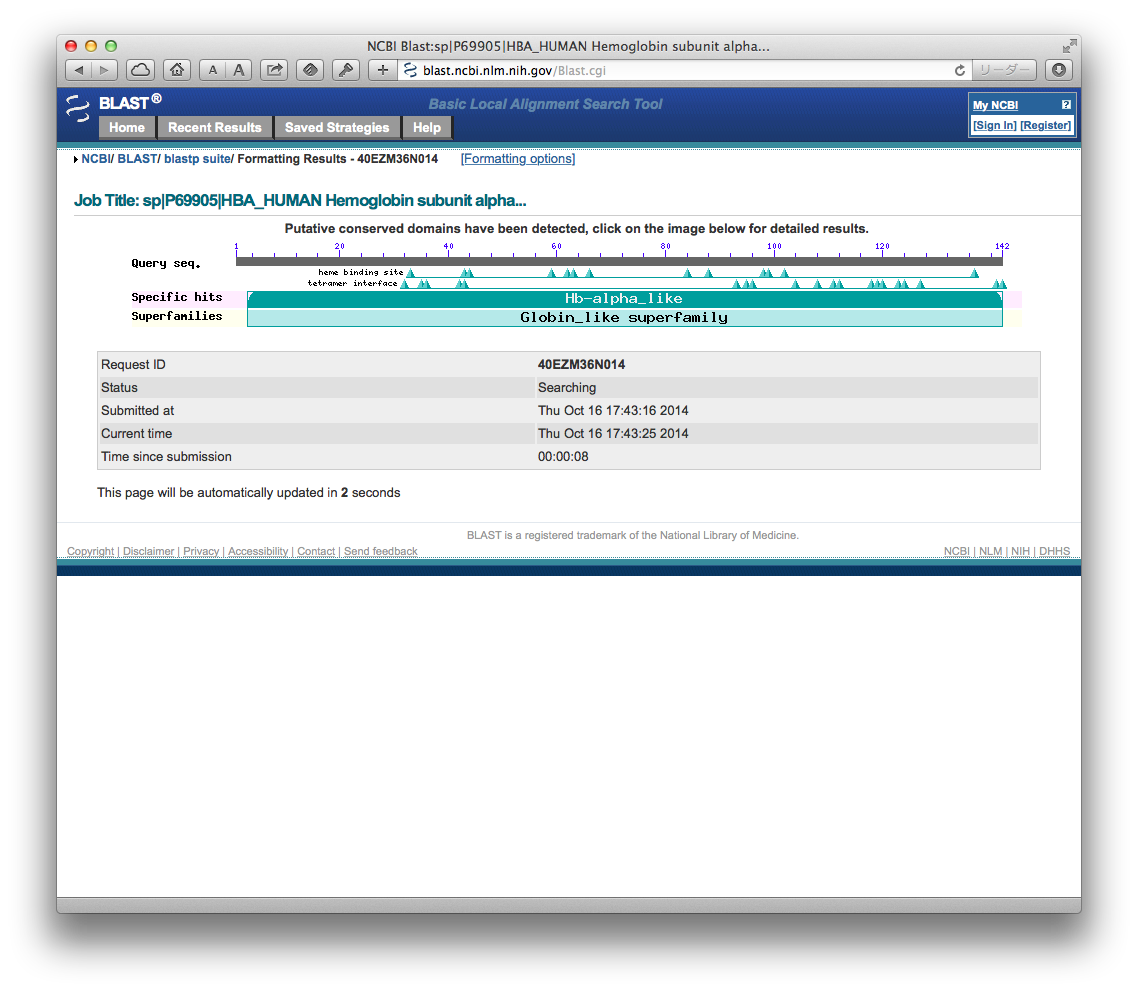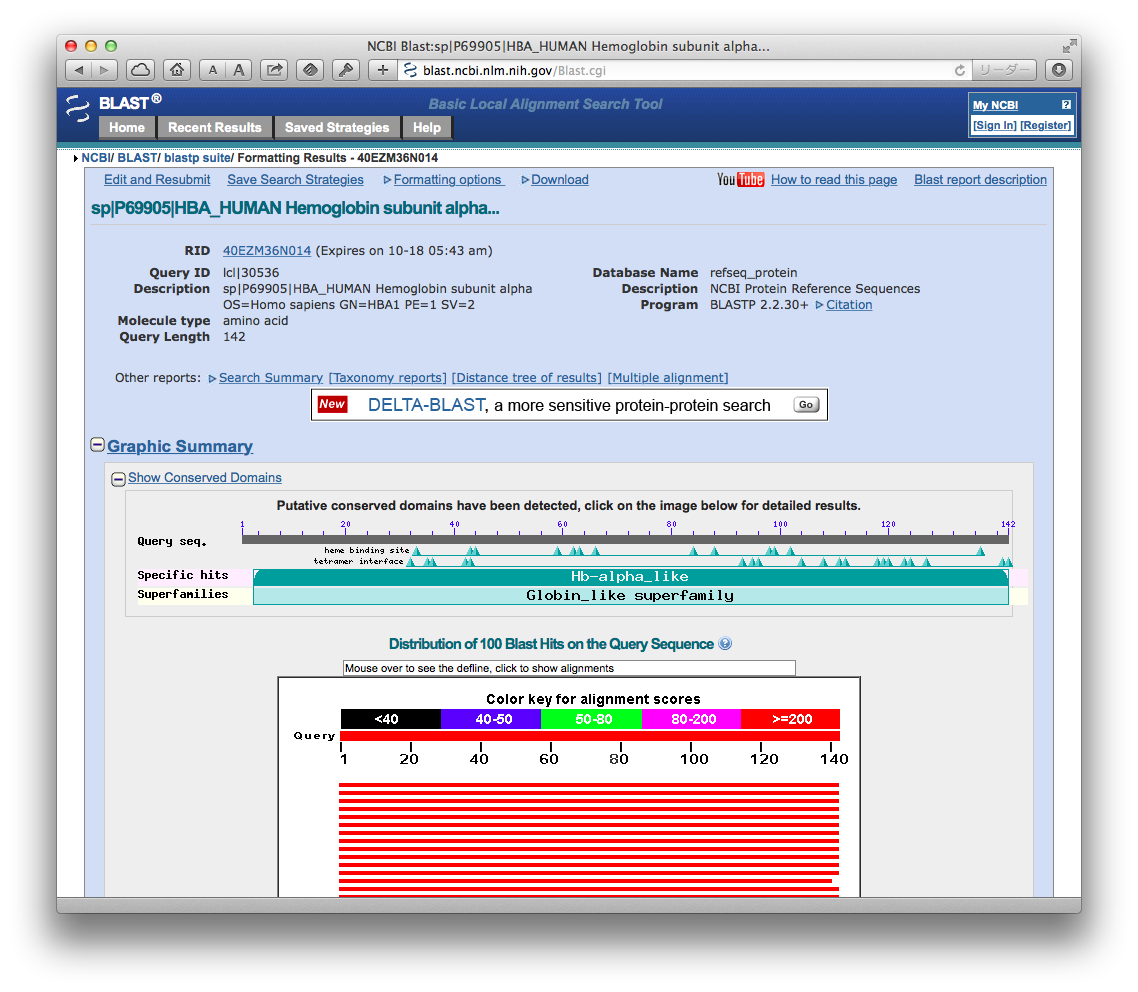 ここでは,ヒトのヘモグロビン HBA_HUMAN のアミノ酸配列をクエリーとして,NCBIのBLASTで,refseq を対象にして検索してみます.