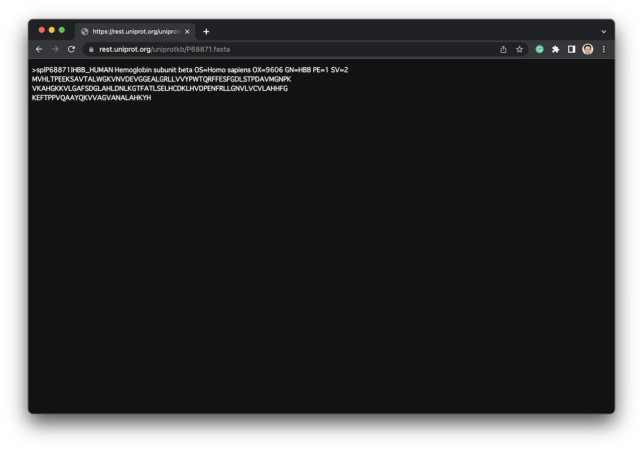 すると、次のようなFASTA形式のアミノ酸配列が表示されます。