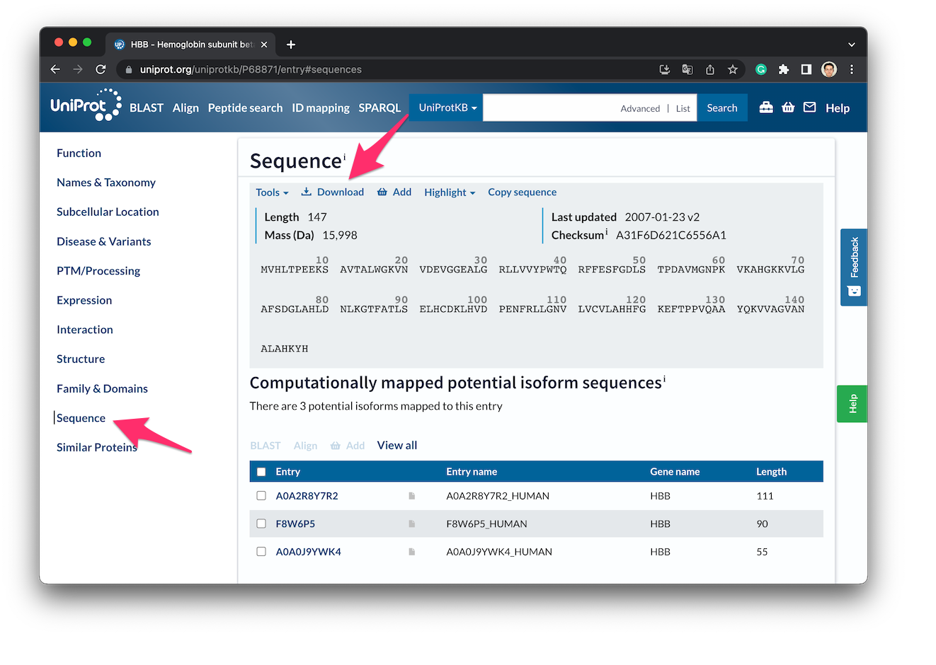 Entryのリンクをクリックして、タンパク質の情報を表示し、左側のメニューにあるSequenceをクリックしてSequenceのセクションにジャンプし、downloadをクリックします。