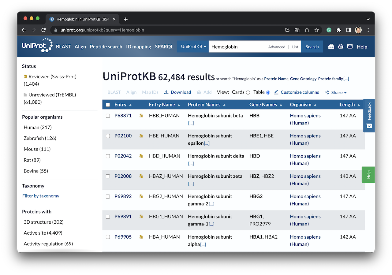 UniProtにHemoglobinと入力してヘモグロビンを検索します。 Entryは登録ID、Entry nameは登録名、Protein namesはタンパク質名、Gane namesは遺伝子名、Organismは生物の種類、Lengthはタンパク質の長さを表します。